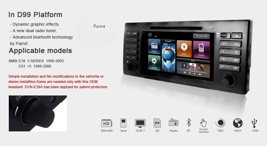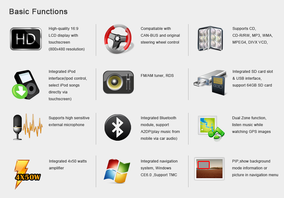 Full Digital LCD, 800x480 resolution, GPS Function, FM/AM Tunner(RDS), Bluetooth Funciton, IPOD Funciton, TV receiver Function,SD Card/USB...